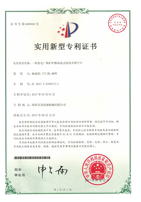 新聞中心下支撐折疊式鍋爐爐膛檢修平臺行業首項國家專利發明者